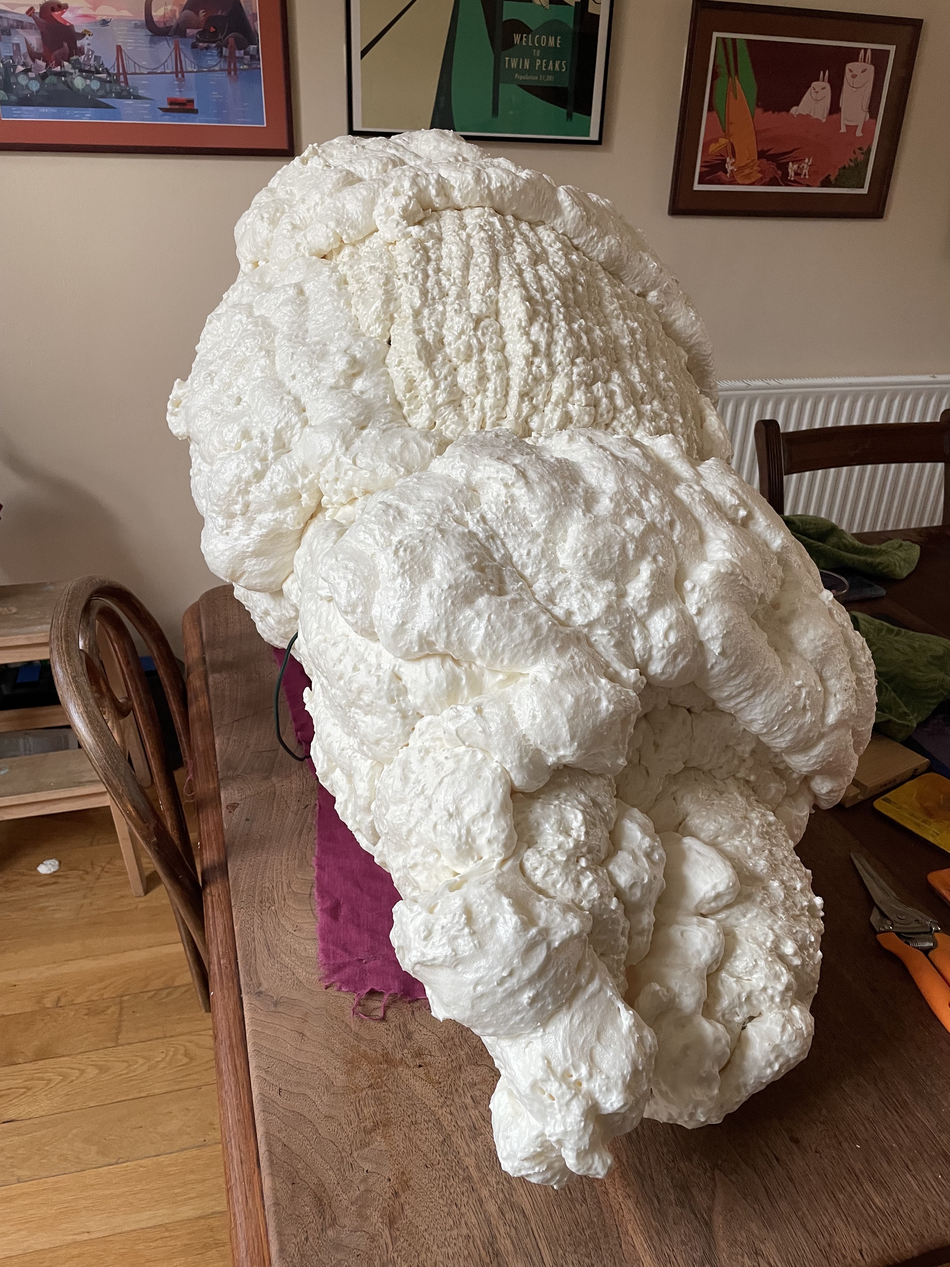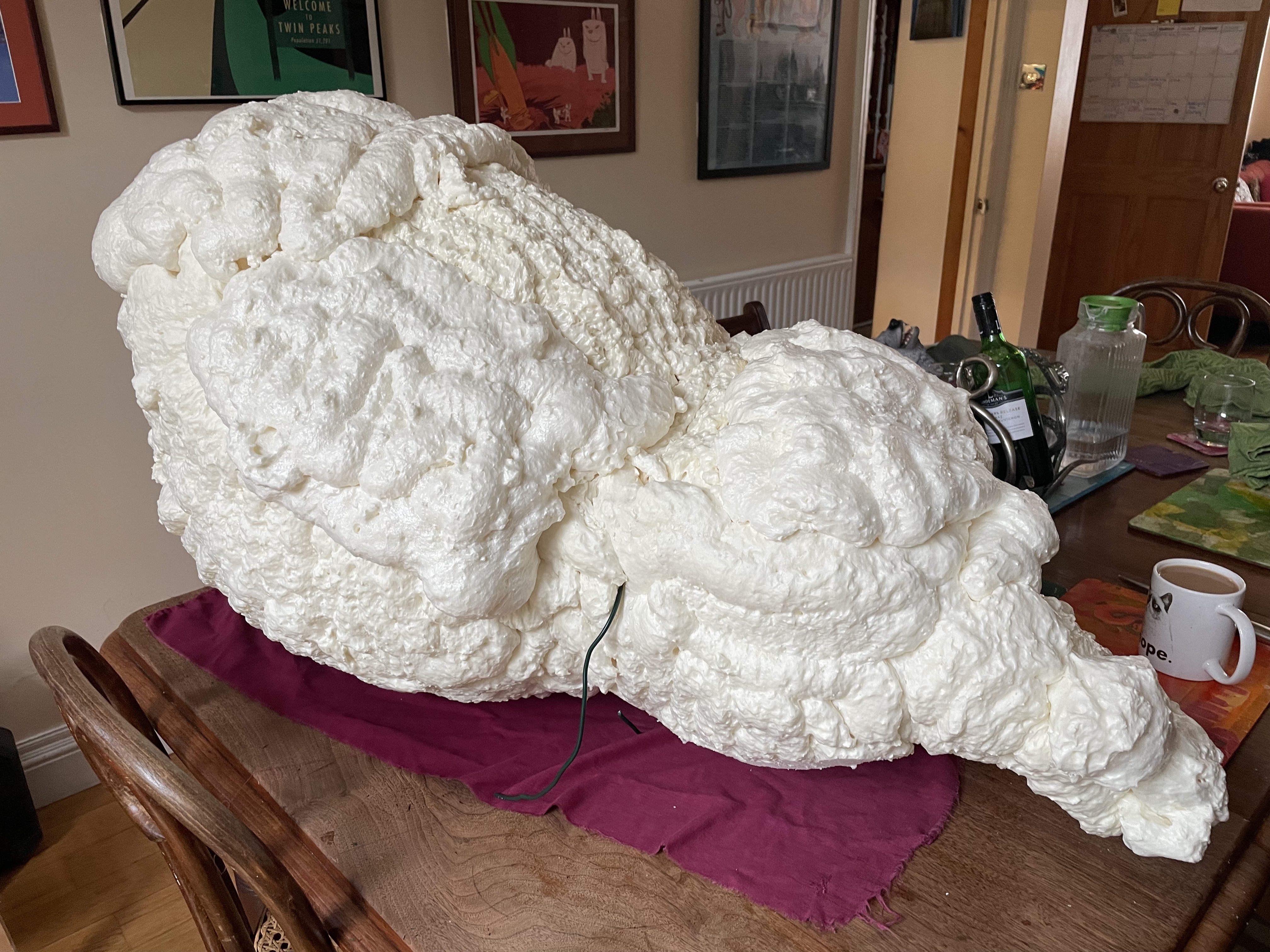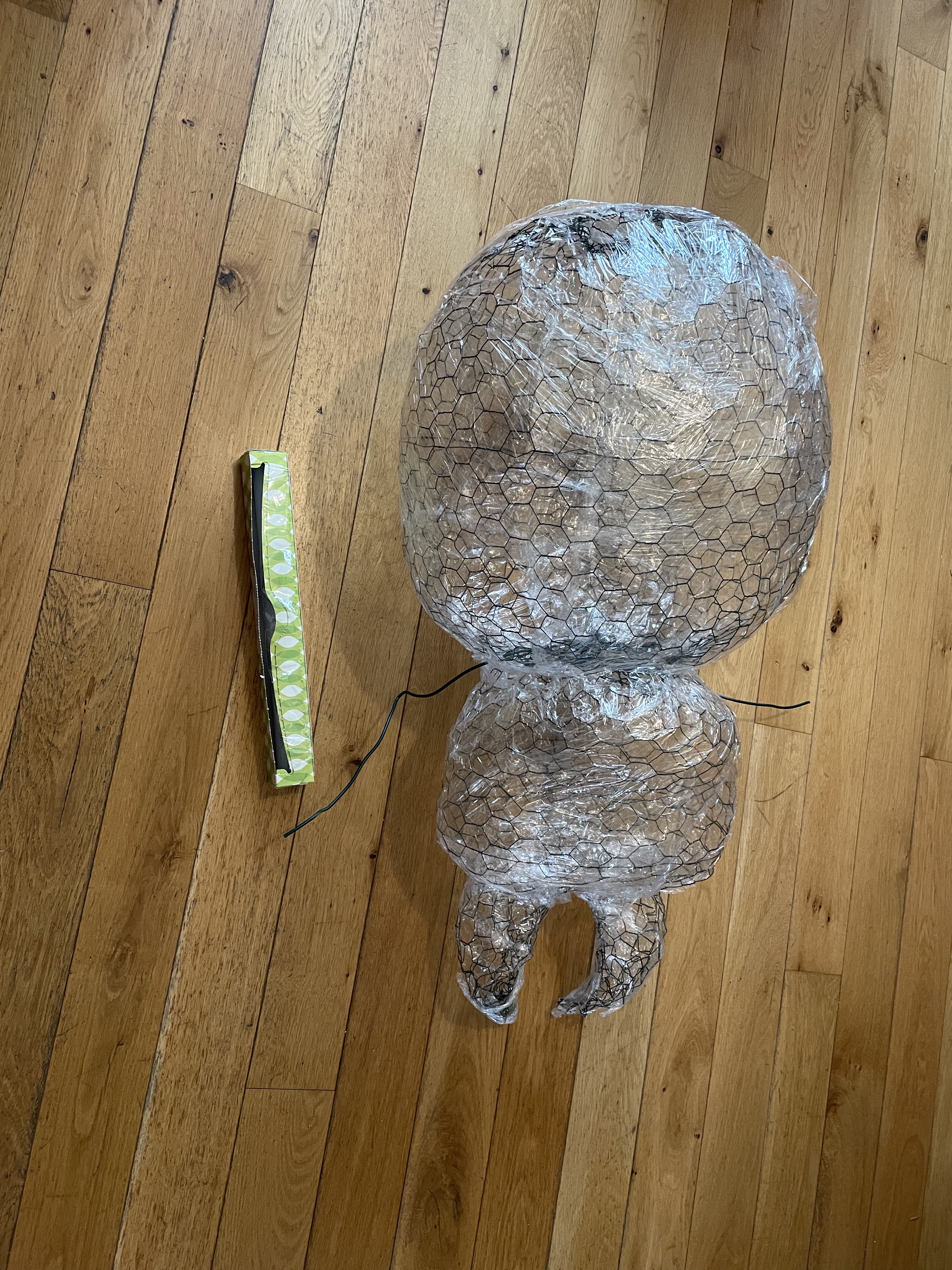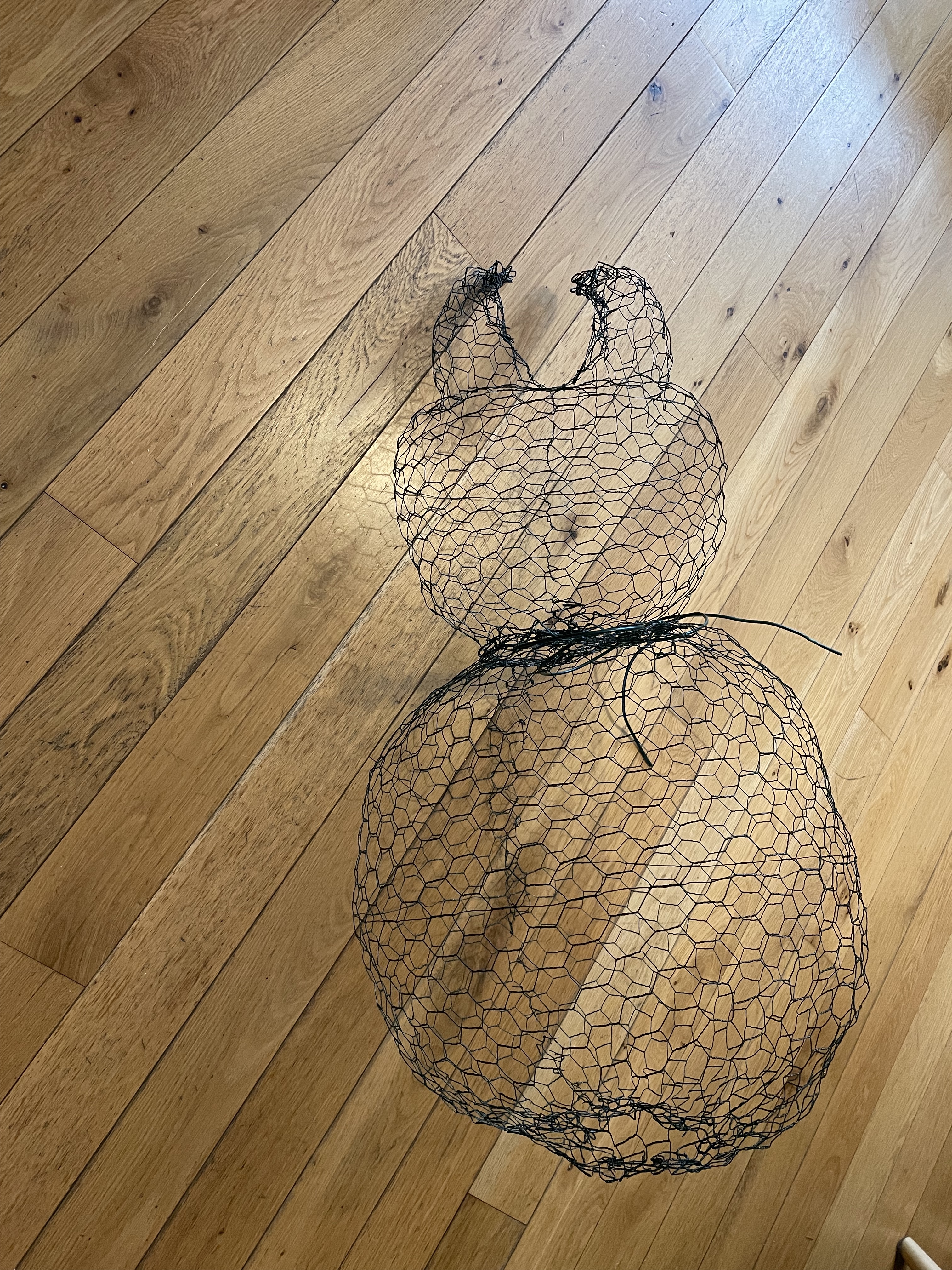 Her body is made of chicken wire and spray insulation foam, her legs are foam pipe insulation with heavy wire inside so they’re posable, and her eyes are huge Christmas ornaments!