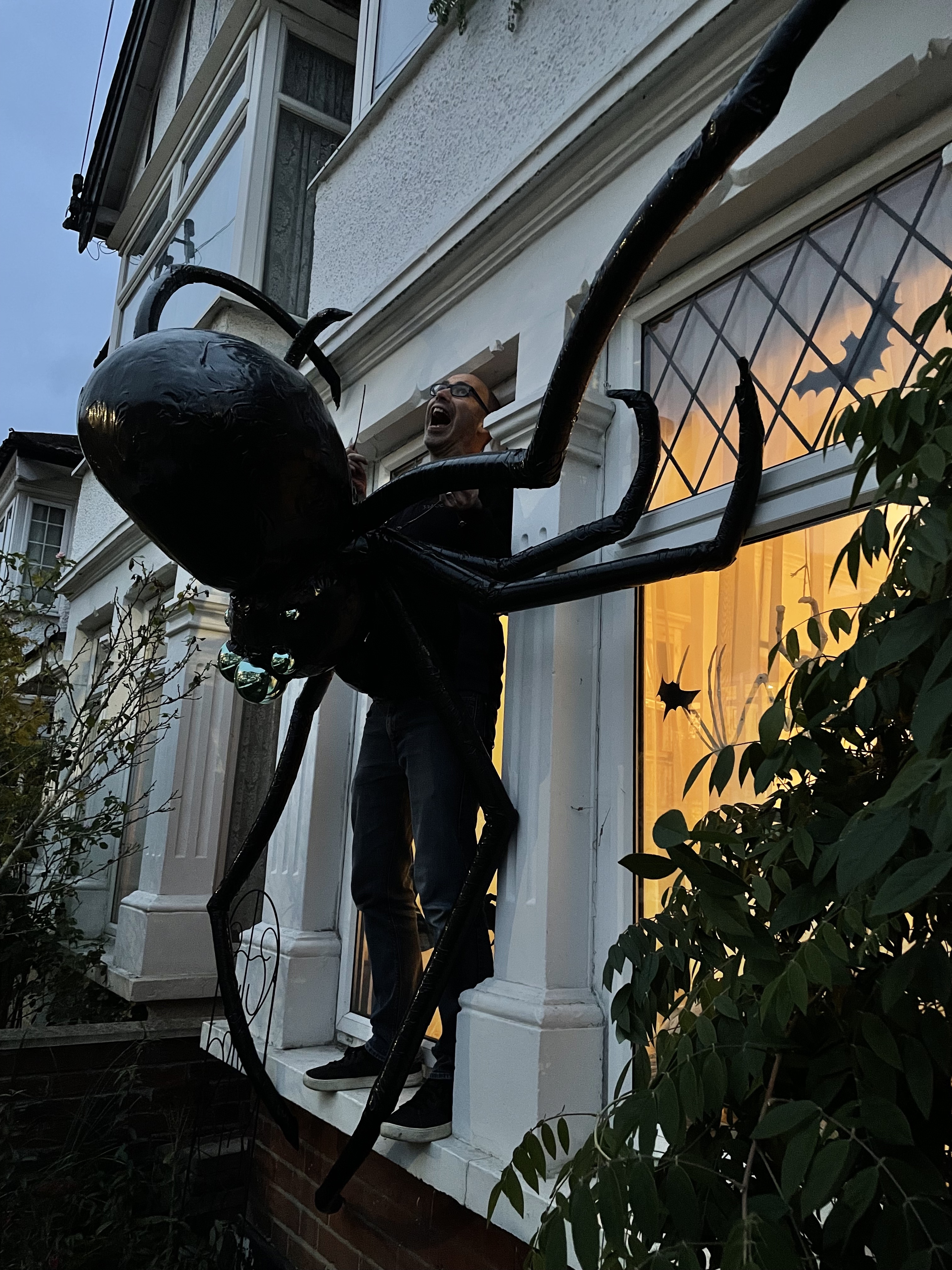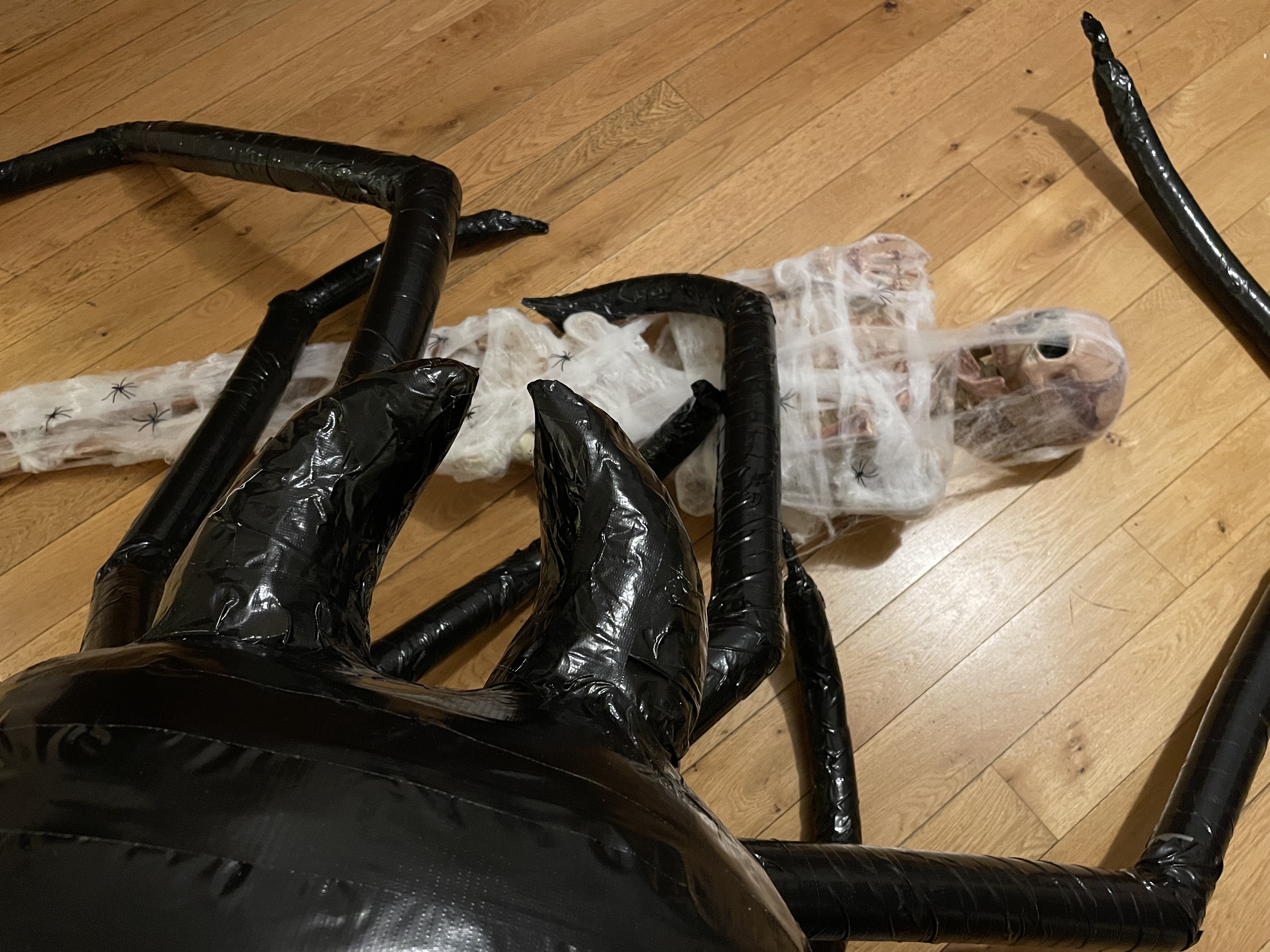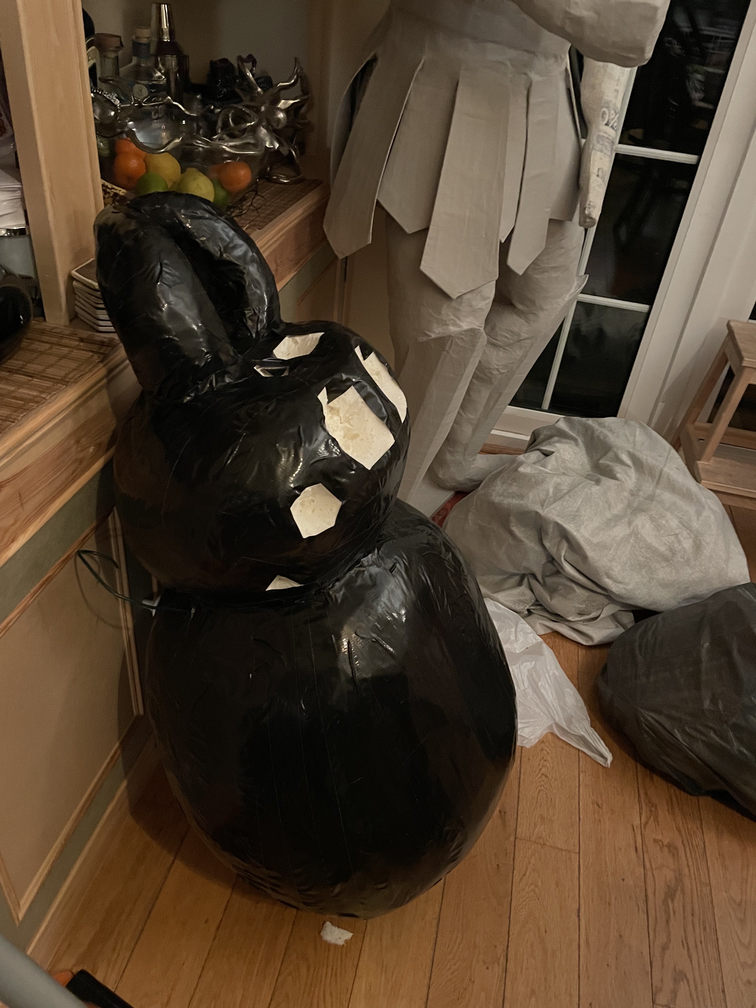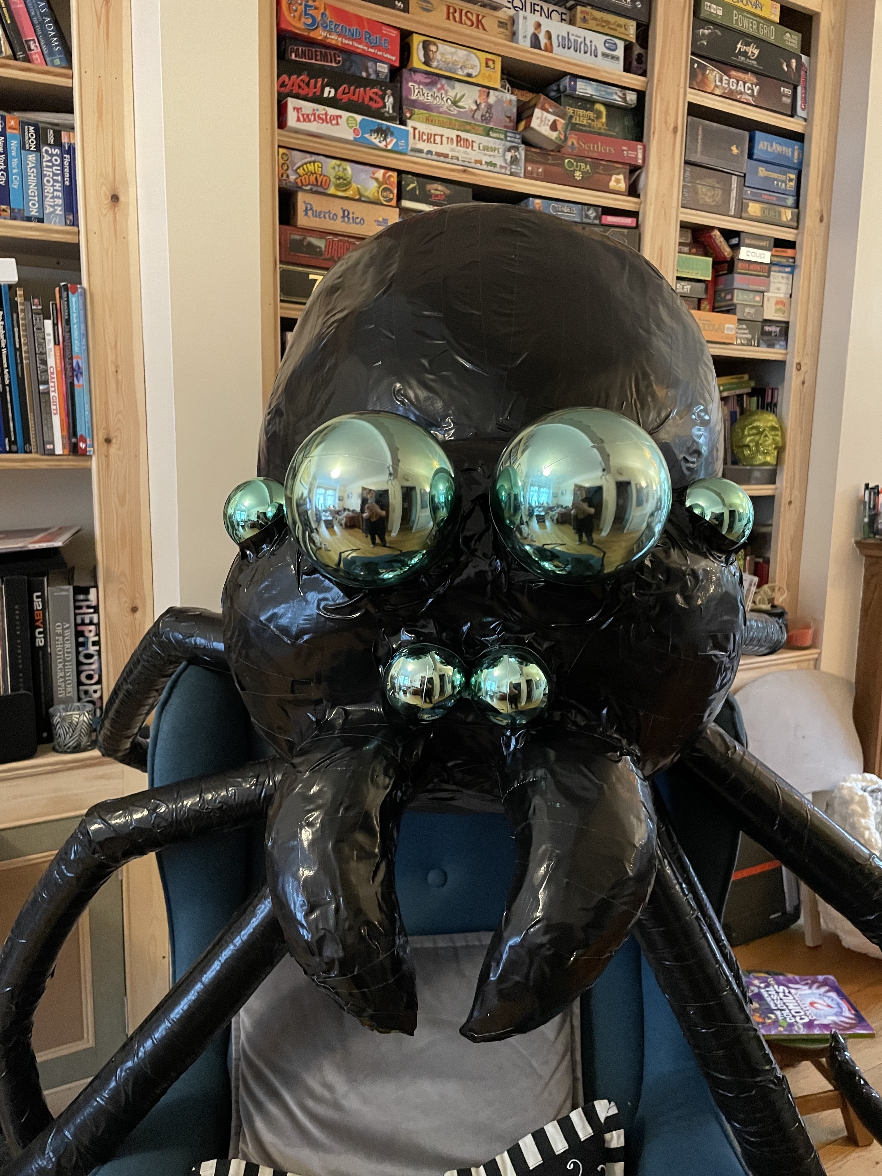 Her body is made of chicken wire and spray insulation foam, her legs are foam pipe insulation with heavy wire inside so they’re posable, and her eyes are huge Christmas ornaments!