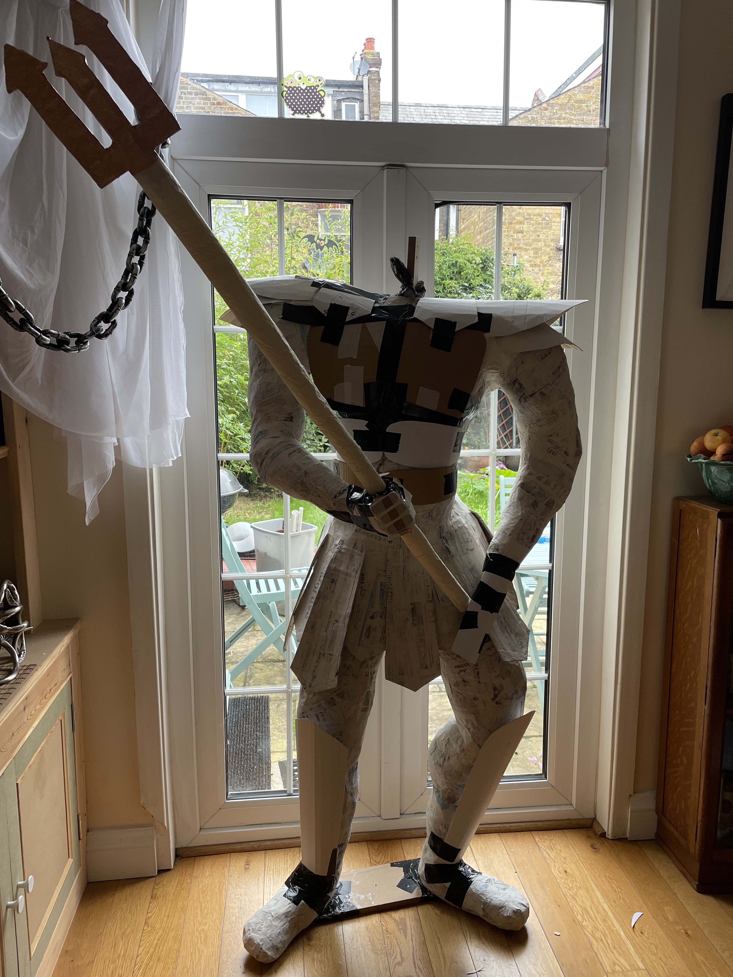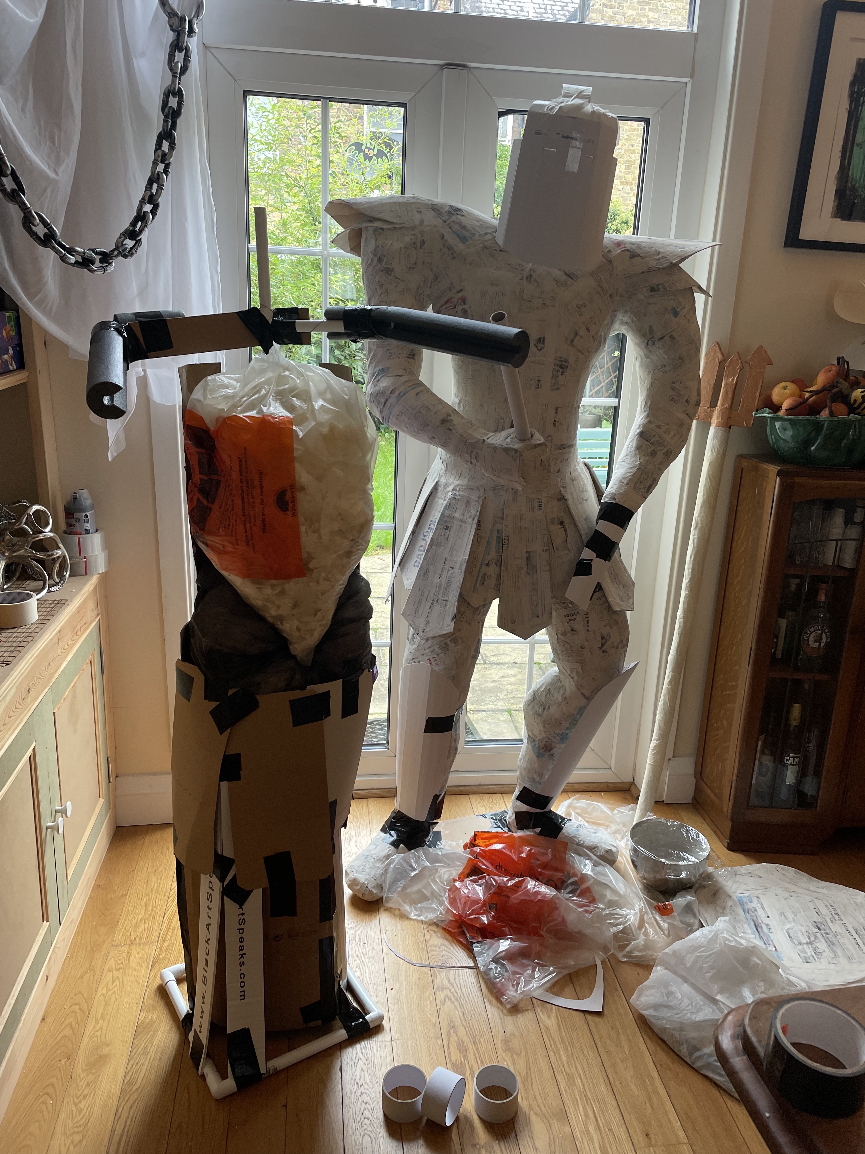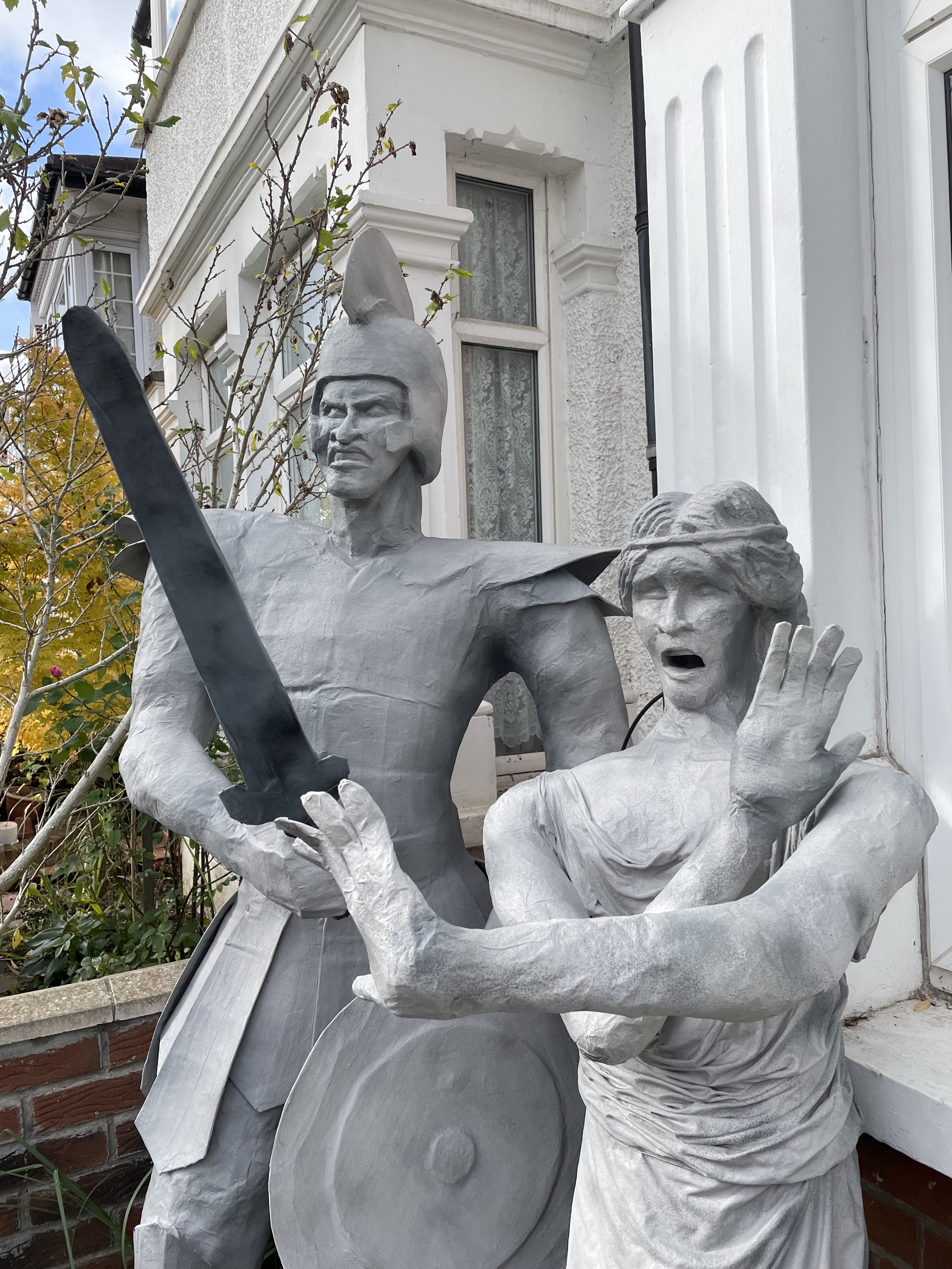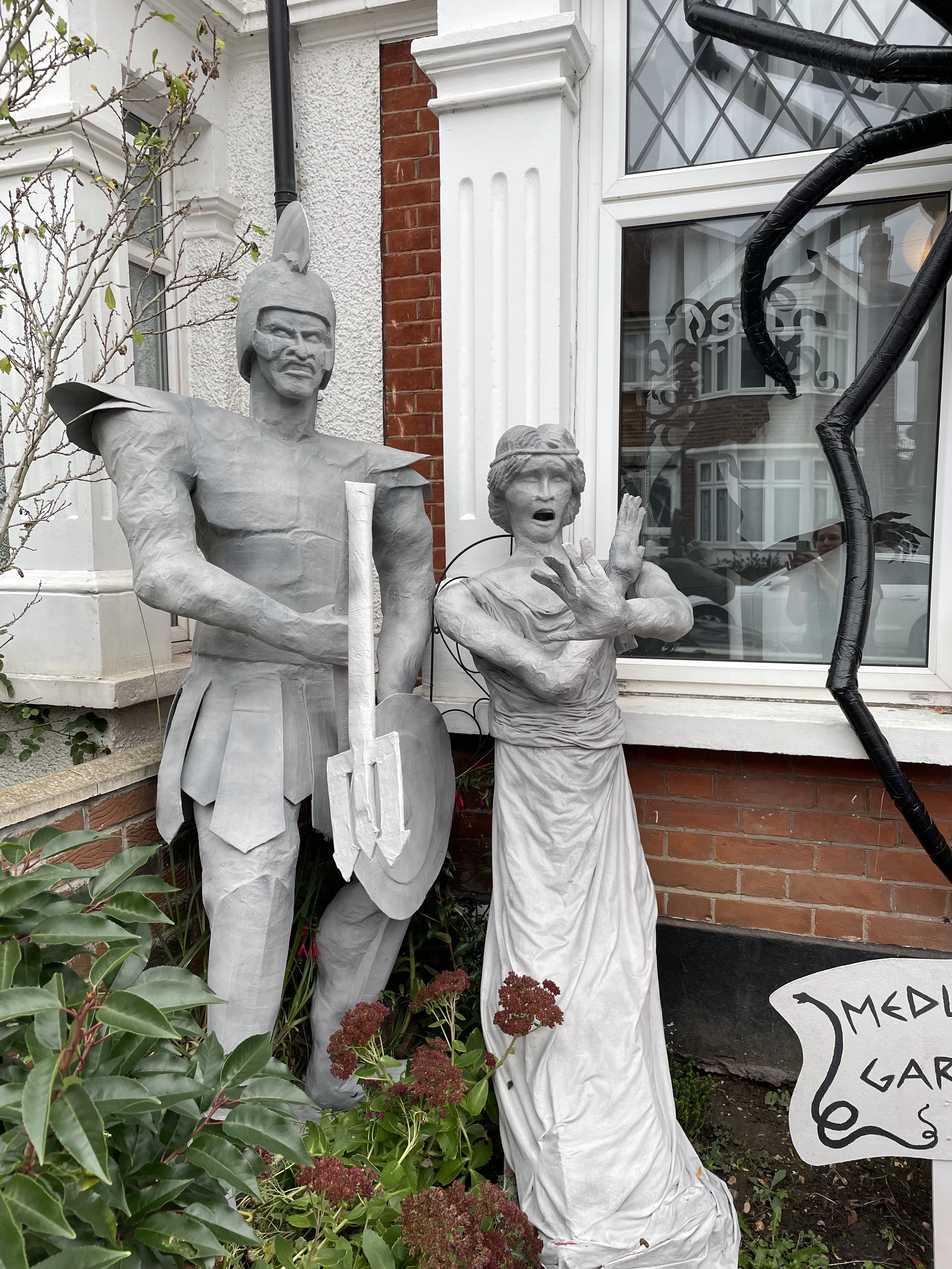 Halloween 2021 was Greek Mythology themed and included Cerberus’ three-headed doghouse, Arachne’s weaving workshop, Cy Clops’ Monocles shop and a couple unfortunate adventurers who crossed Medusa. I created a guide to the statues on Instructables. They’re made of scrap wood and PVC frames, cardboard, foam and papier mache.