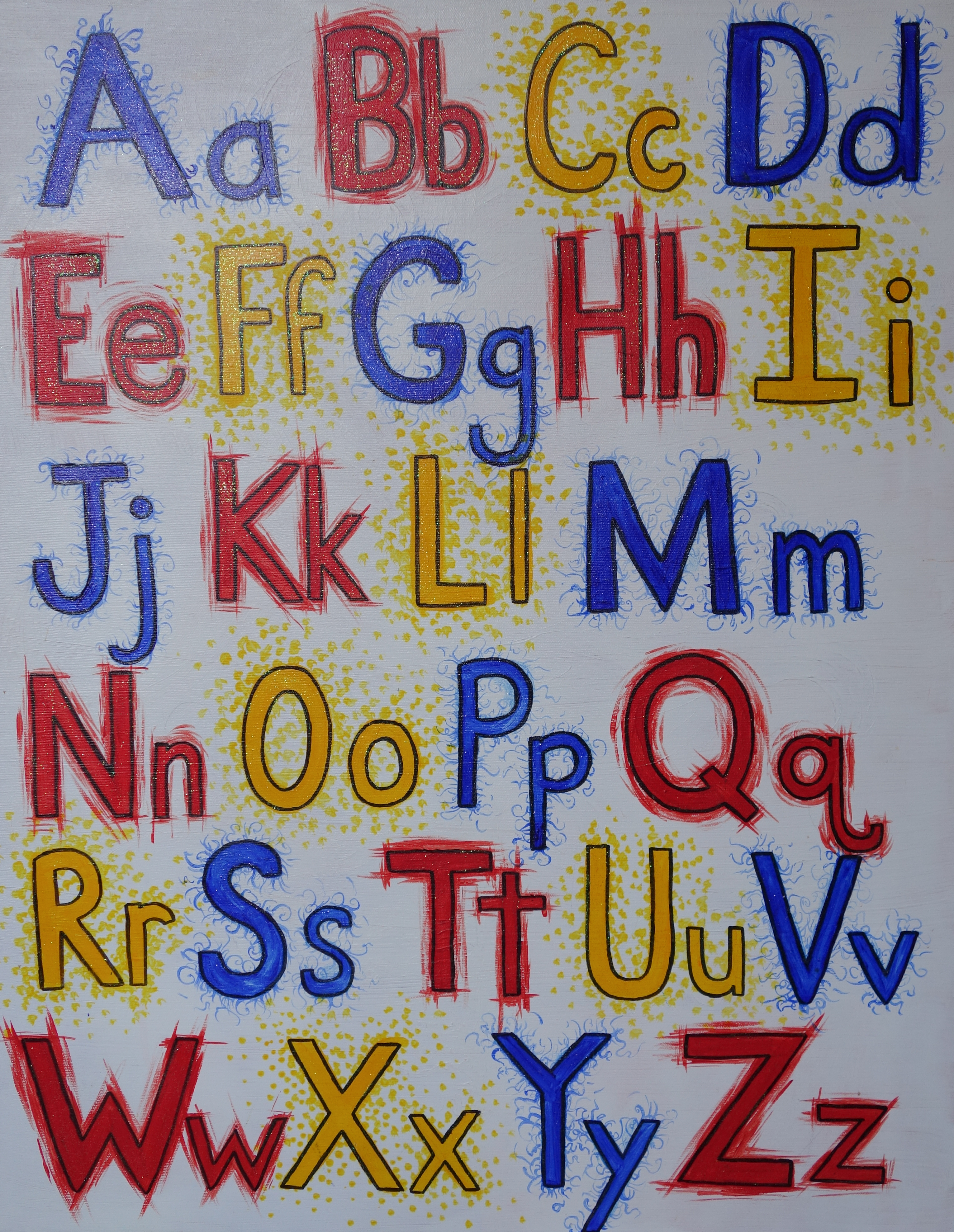 Case in point: When my daughter was learning to write, I decided on a whim one day to paint a letter chart on a big canvas and prop it up behind her desk. So far so good. I wanted it to dry quickly, so grabbed the acrylics and picked primary colors to make it simple and bold (also, I couldn’t find the green and the acrylics I have make a mucky green when mixed. Have I mentioned how much I hate acrylics?). I painted the letters, everything still going well enough (other than some spacing issues, but that’s what I get for free-handing) — but it was too boring. I know, I thought: I’ll add some texture, some designs.